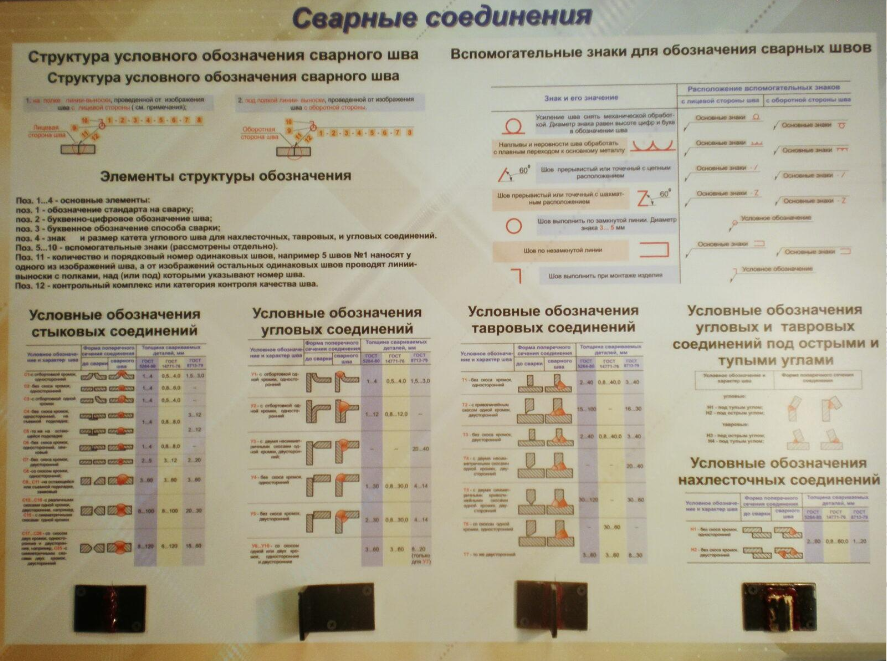 На планшете дана система условных обозначений сварных соединений и натуральные образцы соединений, классификация и характеристики сварных швов и примеры сварных швов на чертеже. Планшет изготовлен из фанеры, с наклеенной на нее подложкой из пластика ПВХ с полноцветной печатью. По периметру планшет окантован алюминиевым