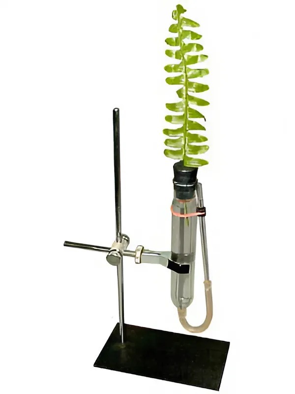Прибор представляет собой U-образный сосуд с узким и широким коленом (стеклянные трубки). Одна стеклянная трубка прямая и узкая, другая – широкая, сужающаяся к низу. Центральная часть прибора изготовлена из трубки ПВХ (для уменьшения хрупкости), соединяющей широкую и узкую стеклянные трубки. В широкой трубке размещают корневую систему растения. Растение закрепляют в приборе с помощью разрезной пробки, в которой дополнительно просверлен канал для того, чтобы было удобно вводить стебель растения в пробку. Узкая трубка с двумя резиновыми колечками предназначена для демонстрации изменения уровня воды в приборе в ходе опыта.