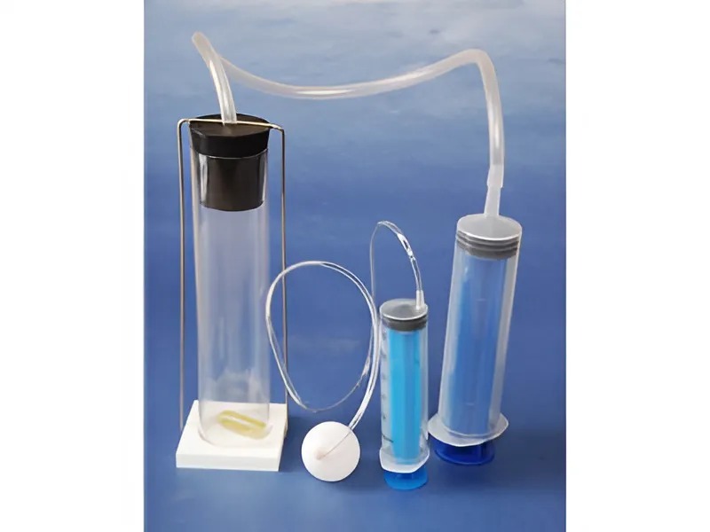 Пробка соединена трубкой с насосом (пластиковый шприц объемом 150 мл). Шар соединен трубкой с насосом (пластиковый шприц объемом 60 мл) и слегка утяжелен в той части, где расположено отверстие, чтобы при плавании шара отверстие было в воде.