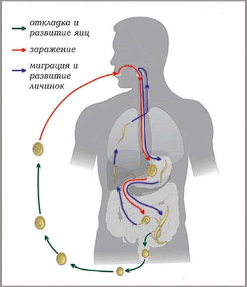 При заражении зрелое яйцо (Х7) проникает сначала в желудок, а затем в кишечник, где зародыш выходит из яйца (Х8). Далее происходит миграция и развитие личинок (Х9-Х11), в ходе которой они перемещаются в легкие, поднимаются по трахее, заглатываются и вновь через пищевод и желудок попадают в кишечник, где и живут взрослые аскариды (Х12). Взрослые особи аскариды раздельнополые, они спариваются и откладывают яйц (Х4), которые выводятся из организма с фекалиями. Во внешней среде происходит развитие зародыша внутри яйца (Х4-Х7) В дальнейшем они могут попасть в организм другого человека, где произойдет развитие новых паразитов.