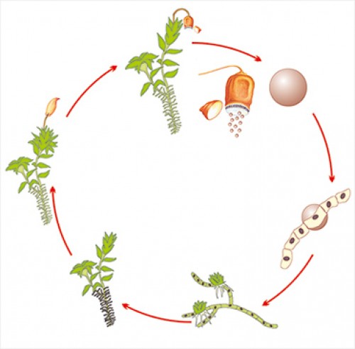 На схеме показано, как из коробочки спорофита высыпаются споры. Каждая спора дает жизнь новому молодому гаметофиту. Гаметофит растет и развивается до той стадии, на которой наличие благоприятных условий позволяет, на его верхушке, вырасти спорофиту. Цикл повторяется.