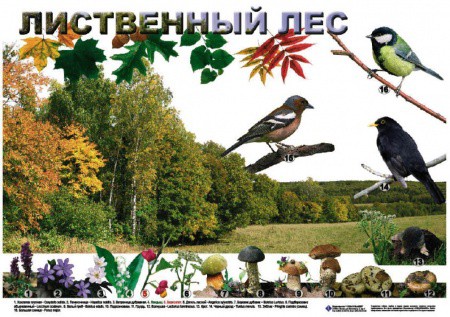 - 9 таблиц рассказывают об отдельно взятом сообществе: Водоём, Лиственный лес, Луг, Поле, Экологические связи, Смешанный лес, Хвойный лес, Болото, Сад