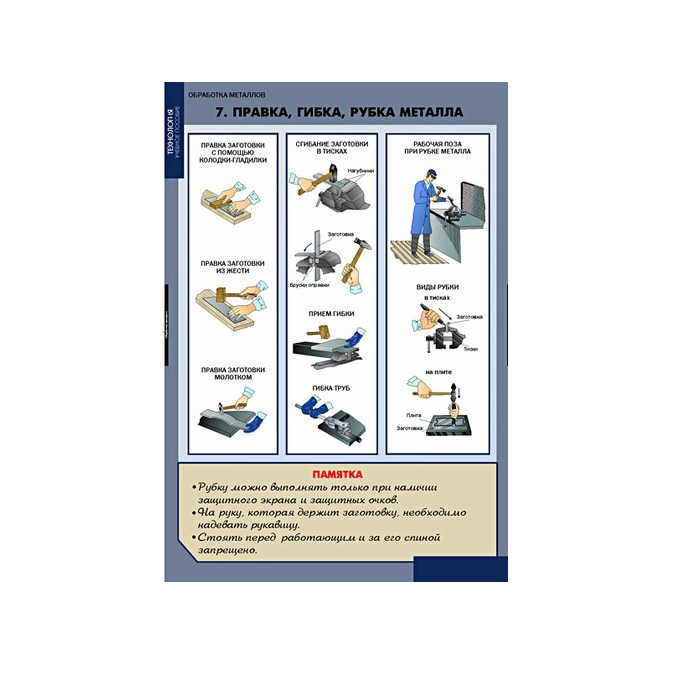 Общие правила поведения в учебных мастерских. Рабочее место учащегося. Инструменты для ручной обработки. Графическое изображение деталей. Технологическая карта. Разметка заготовок. Правка, гибка, рубка металла. Разрезание, опиливание металла. Резьба, её виды. Сверление, точение. Сборка деталей, отделка изделий.