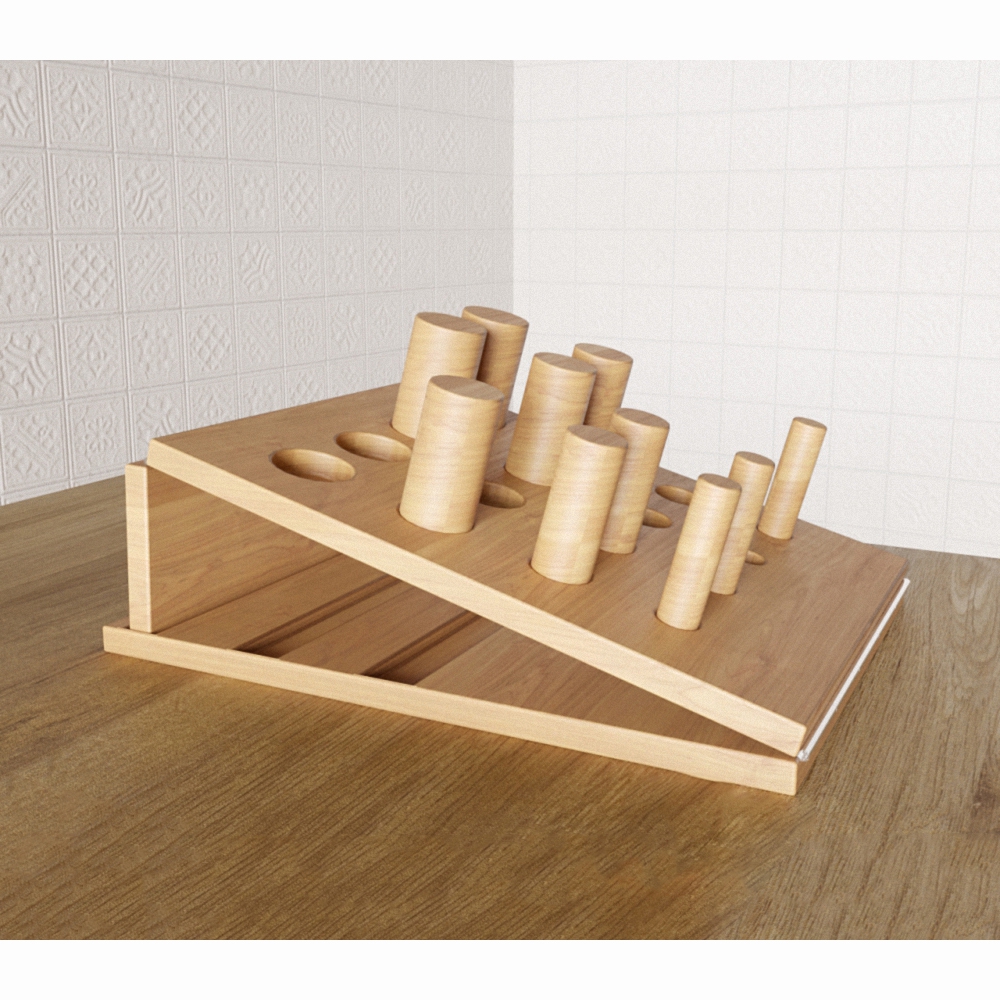 Подставка этого реабилитационного модуля находится под наклоном для удобства использования. В отверстия необходимо подирать и вставлять деревянные бруски подходящего размера. После того, как ребенок освоил движения, он учится регулировать их интенсивность и плавность.