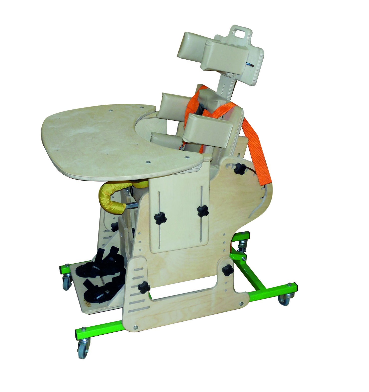 Опора для сидения представляет собой ортопедическое кресло на деревянной раме, расположенной на металлическом четырехколесном основании. Все колеса поворотные, задние колеса оснащены стояночными тормозами. Сидение и спинка оснащены съемными мягкими подушками и мягкими упорами-ограничителями. На подножке расположены пластиковые крепления для ступней типа «сандалии» с задними упорами и крепежными ремешками. Опора оснащена подголовником и съемным столиком, устанавливаемым на подлокотники.