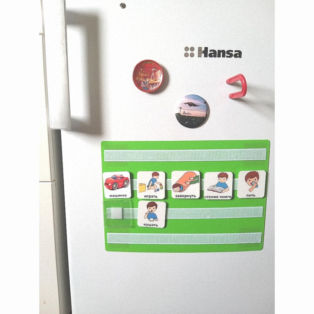 На обратной стороне 4 магнита, благодаря чему лист крепится к холодильнику или жестяной доске.