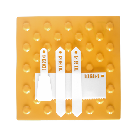 Для укладки плитки на пол в зданиях и помещениях или на улице потребуется зубчатый шпатель, поскольку он, в отличие от шпателя с прямой гранью, даёт возможность наносить клей ровным слоем. Кроме того, такой шпатель «выгоняет» из клеевой массы пузыри воздуха, которые могут снизить качество приклеивания плитки. Шпательная лопатка предназначена для нанесения клея на индикаторы для приклеивания конусов и полос. Расшивка — служит для обработки швов, с их помощью удаляют излишки клея. Удобная для работы пластмассовая рукоятка оснащена отверстием для подвешивания изделия после применения.