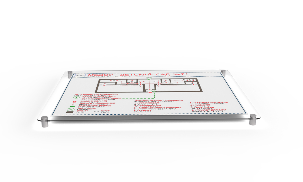 Сочетает в себе плоско-выпуклые элементы схемы и путей движения и надписи, нанесенные рельефным способом и дублированные азбукой Брайля. Позволяет людям с нарушенным зрением самостоятельно ориентироваться в пространстве.