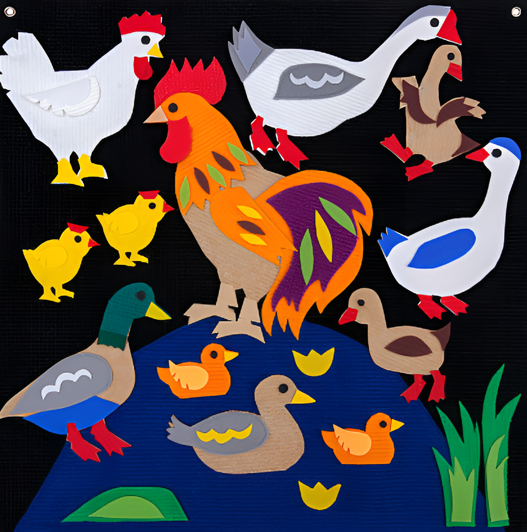 На основание на липучках прикрепляются разные по текстурам фигурки домашних птиц: петух, курица, цыплята, гусь, гусыня, гусята, утка и утята.