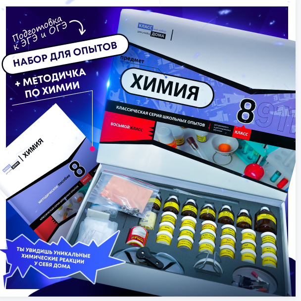 С помощью набора «Химия 8 класс» школьники научатся самостоятельно проводить химические опыты и смогут дополнительно подготовиться к экзамену по химии.