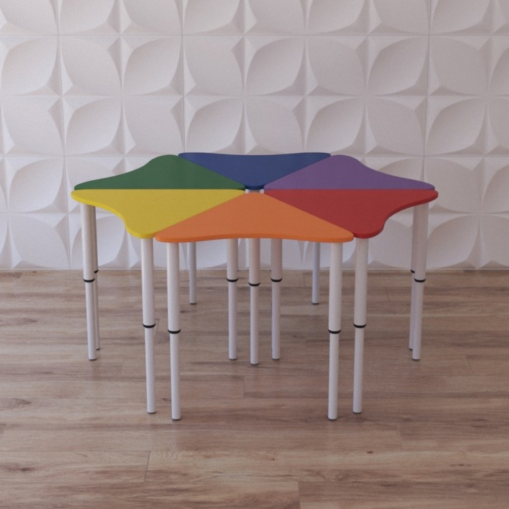Стол растущий на регулируемых ножках "Лети лепесток" – это ещё и комплект одноместных столов для оснащения учебными местами групп в ДОУ и яслях, коррекционных и развивающих центрах. Каждый из столиков состоит из столешницы и трёх телескопических ножек – благодаря им его можно отрегулировать на нужную высоту. Стол растущий на регулируемых ножках из шести лепестков станет незаменимым предметом мебели для детей; за ним могут с комфортом разместиться до 6 детей.