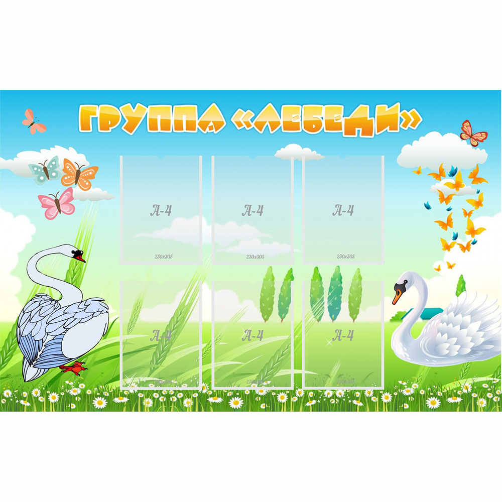Грациозные белые птицы на фоне летнего пейзажа, множество разноцветных бабочек и яркие буквы названия стенда в белой окантовке - всё это не может остаться незамеченным детьми и их родителями. А в шести удобных карманах формата А4можно разместить списки детей, имена и контактные данные воспитателей, правила поведения или другую полезную информацию для родителей.