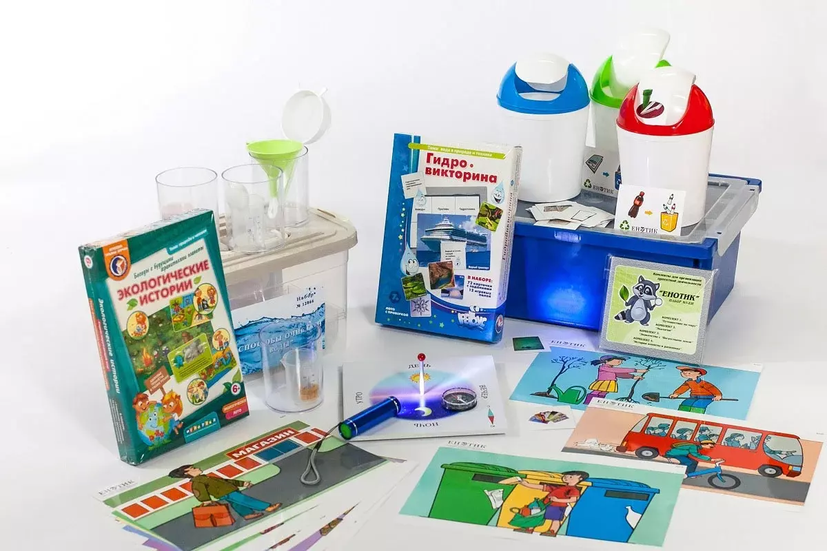 • Комплект № 2 «Экология». В комплект входят демонстрационные и раздаточные материалы: магнитные плакаты-аппликации. Комплект содержит: поле, комплект карточек с изображениями, карточки «Воздействие человека на окружающую среду», набор для наблюдения за природой, лабораторные приборы и оборудование для экспериментирования с водой, модель солнечных часов, муляжи, видео-контент, журнал проекта.