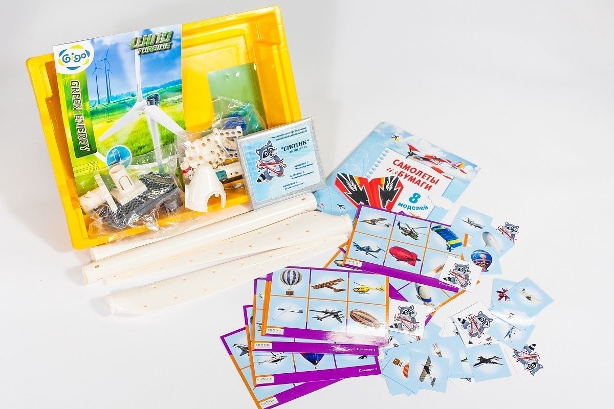• Комплект № 2 «Авиамоделирование». В набор входят элементы для конструирования из различных материалов – пластмасса, бумага, карточки-схемы, видео-контент, журнал проекта.