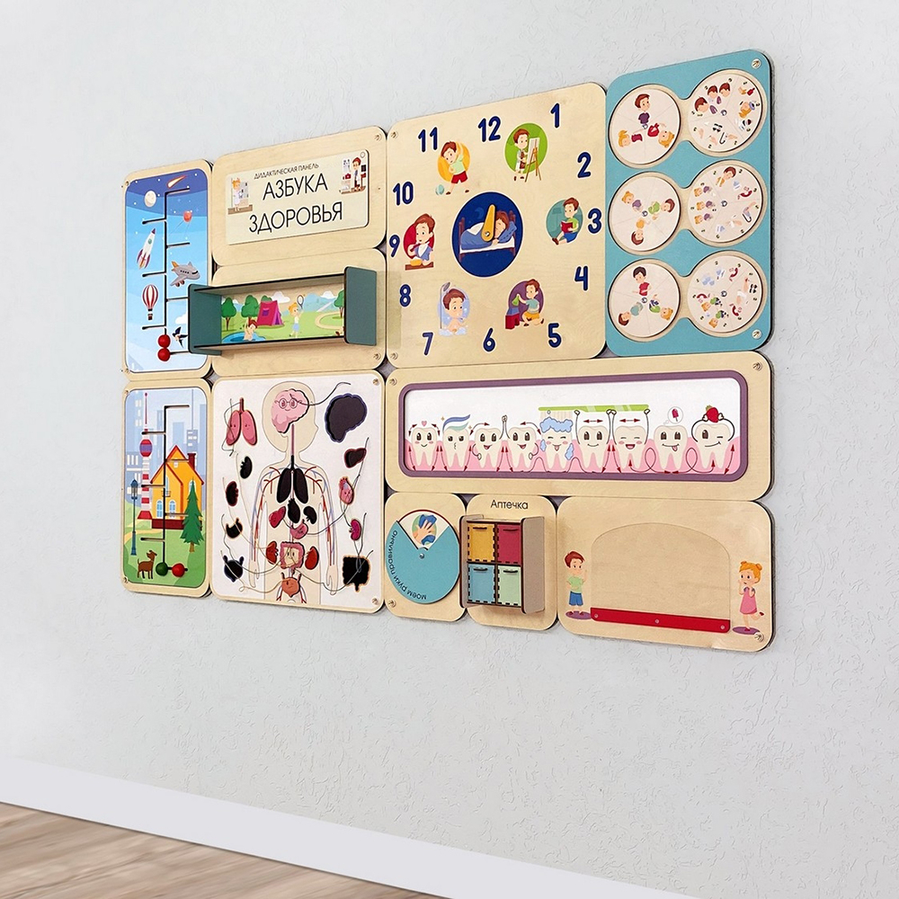Каждый модуль панели нацелен познакомить детей со строением тела, фазами сна, уходом за зубами, первой медицинской помощью, тренировкой зрения.