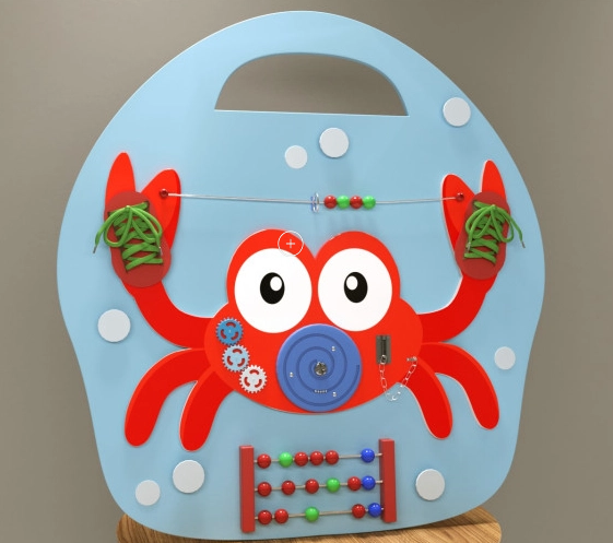 Бизиборд в виде краба — это детский игровой модуль с высокой игровой ценностью. Сложностей с размещением не возникнет – игровой модуль достаточно компактен. Выполнен в форме «корзинки», на которой расположен Крабик с пузырьками и разнообразными игровыми элементами. Поверхность обработана специальным образом и имеет многослойное покрытие из экологически безопасных материалов.
