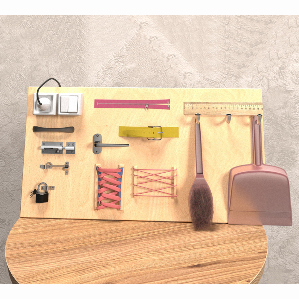 Знакомство с бытовыми делами помогут ребенку освоить элементарные навыки, с которыми он сталкивается изо дня день. Выключатель для света, кран холодной и горячей воды, застежки - привлекают его внимание, а главное - вызывают интерес в повседневной жизни. Тем самым у ребенка совершенствуются качества самостоятельности и независимости. Во время игры развивается память и мелкая моторика.