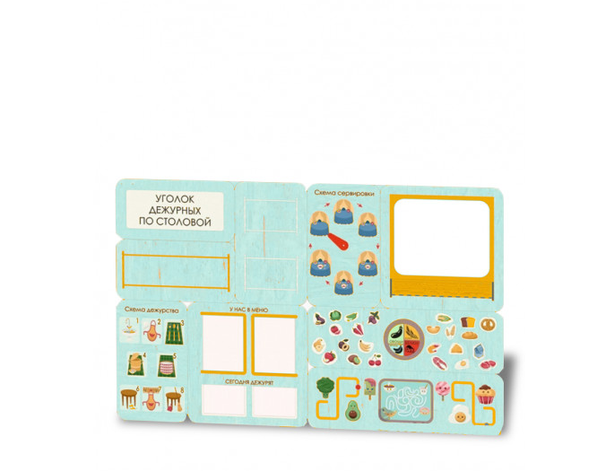 Дидактическая настенная панель детская для главного по столовой- это красивая игровая зона, которая выполнена из качественных материалов и не оставляет зацепок в детских ручках. На панели изображены правильные привычки для детей. Классификация овощей, фруктов, белка и злаков. Схема как необходимо убирать кухню после приготовления и приема пищи. Лабиринты из вкусных десертов и овощей. А также схема-подсказка, как правильно сервировать обеденный стол. Дидактическая настенная панель детская для главного по столовой как для маленьких детей, так и постарше.