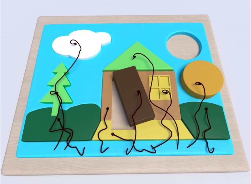 Панель настольная с домиком - это красивая игровая зона, выполненная из качественных материалов и не оставляет зацепок в детских ручках. На полянке в лесу находится домик, в котором части конструкцию легко достаются и вставляются обратно. Все элементы прикреплены веревками, поэтому не потеряются. Рядом есть елочка и тучка, их части тоже легко достать. Панель настольная заинтересует как маленьких детей, так и постарше, а родителям поможет сохранить дом в целости и сохранности. Она подойдет для домашнего использования и для специальных учреждений.