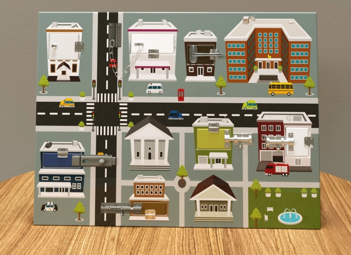 Играя с дверной цепочкой и защёлками, ребёнок приобретает необходимые полезные социально-бытовые навыки. Открывание и закрывание дверок стимулирует развитие мелкой моторики пальцев. Также на примере ярких и красочных картинок можно познакомить ребёнка с понятиями город, проезжая часть и административное устройство.