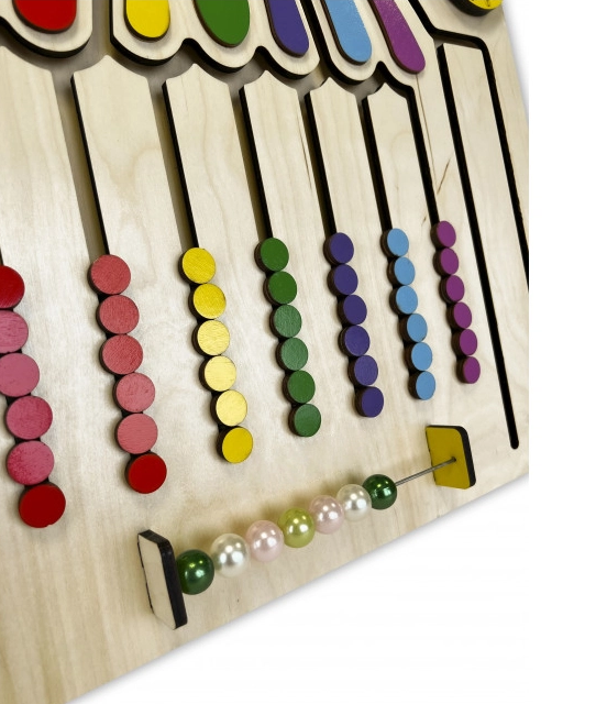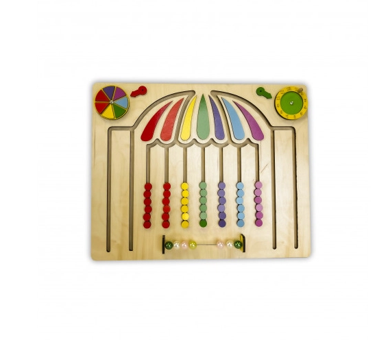 Перемещая разноцветные элементы внутри тактильного лабиринта по траектории с верхушки зонтика вниз (имитируя падение капель дождя), ребёнок может сортировать их по цветам или распределять в произвольном порядке. Счёты познакомят малыша с основами математики, а циферблат – с понятием времени.