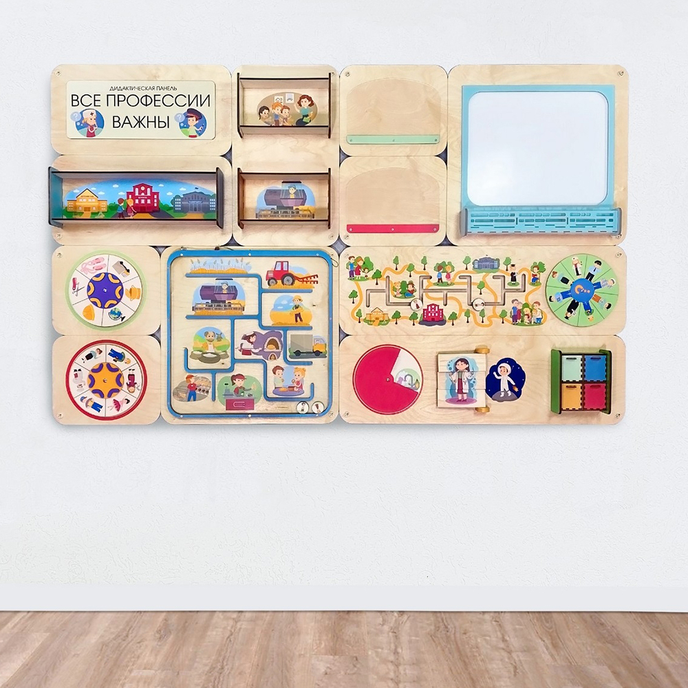 Панель знакомит с разными профессиями и важными этапами жизни человека, развивает логику и мышление, тренирует мелкую моторику и цветовосприятие.