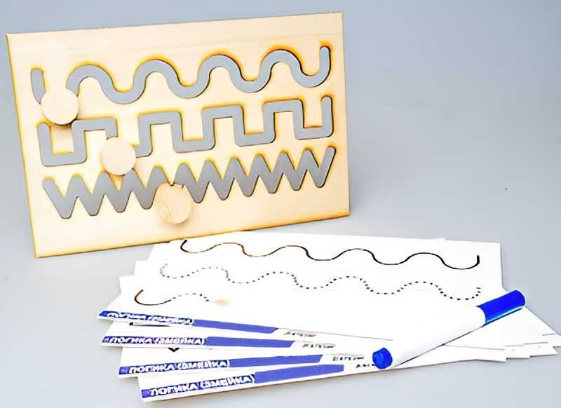Деревянный планшет имеет фигурные прорези и работает по принципу лабиринта. Карточки-схемы повторяют рисунок прорезей на деревянном планшете и также, как и планшет, служат тренажером для развития мелкой моторики и подготовки руки ребенка к письму. Карточки-схемы формата А4 изготовлены из картона, ламинированы пленкой, что позволяет писать на них маркером для белых досок. Написанное легко стирается сухой тряпкой.