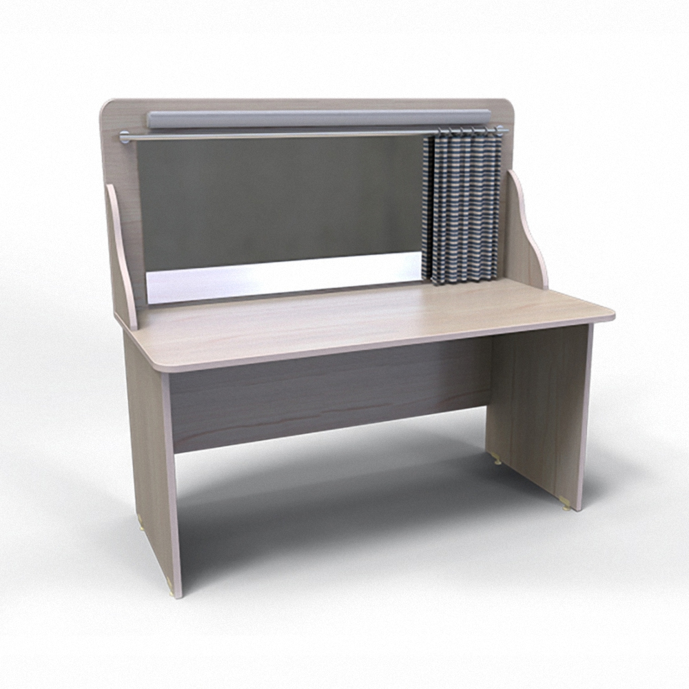 В комплектацию входит уже установленное зеркало, лампа для его подсветки, ширма. Размеры мебели составляют 1025 х 1100 х 520 мм, а вес не превышает 40 кг. На столешнице достаточно места, чтобы хранить дополнительные материалы для урока.