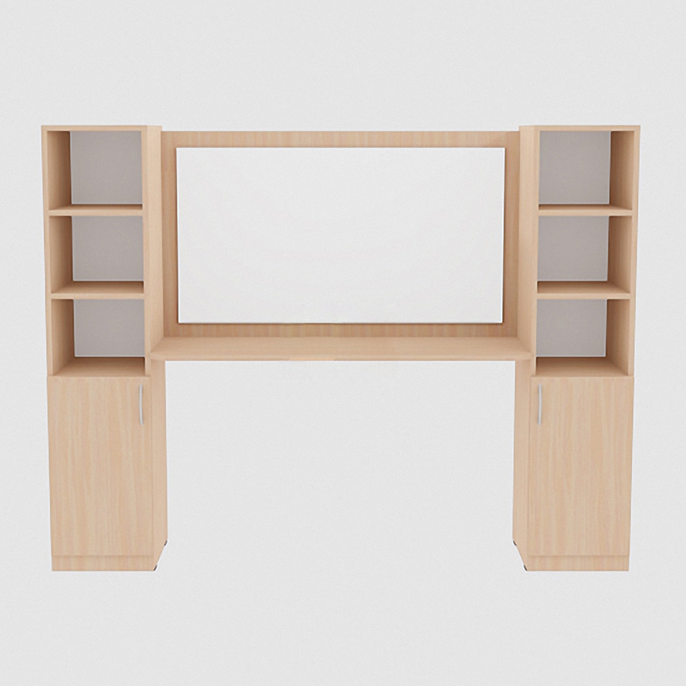В столе внизу по бокам оборудованы 2 шкафа с дверцами. В них удобно хранить методические пособия, книги, тетради. Сверху по бокам сделаны открытые полки. Они подходят для хранения канцелярии, небольших предметов, которые часто применяются. По середине расположено зеркало, которое удобно использовать логопеду для занятий с детьми.