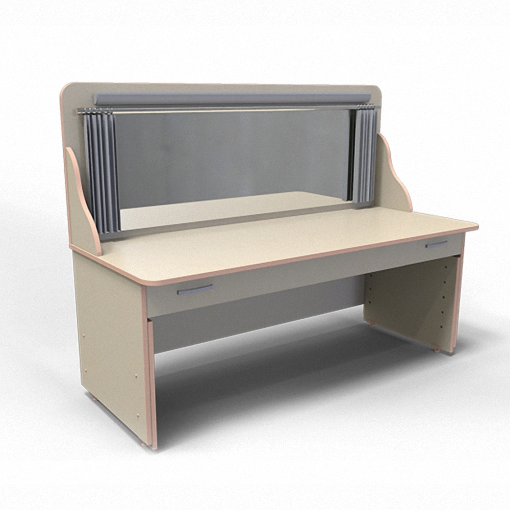 Корпус мебели изготавливается из экологически чистой и безопасной ЛДСП, кромка выполнена из ПВХ. Цвет возможно подобрать на выбор. В комплектацию входит уже встроенное зеркало, которое подсвечивается лампой, ширма и пару ящиков необходимых для дидактических материалов.