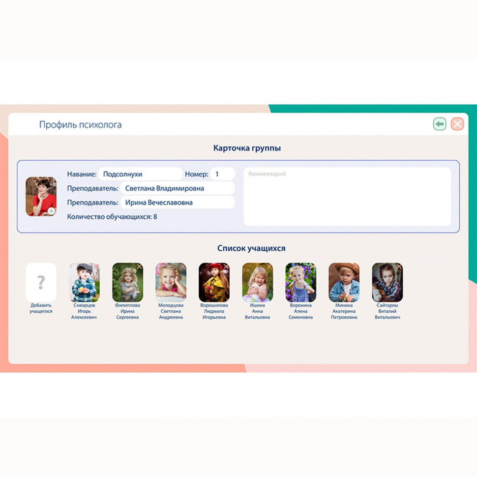 «Профиль психолога» позволяет заводить карточку ребёнка, отслеживать историю работы с ним, фиксирует результаты исследований, формирует готовые отчеты специалисту. Специалист может помещать проективные рисунки детей в профиль ребенка.