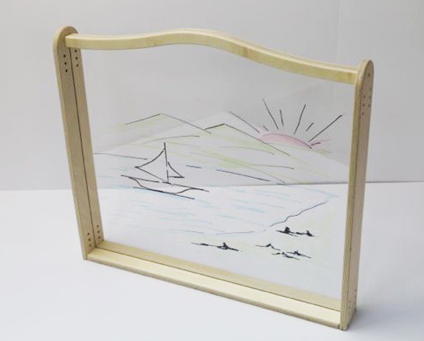 Панель из небьющегося стекла разнообразит занятия живописью, увлечет детей. Рисунок, выполненный на панели "Прозрачный мольберт", можно сохранить на бумаге - приложите к свежему рисунку лист ватмана. Если же рисунок немного подсох, увлажните его, слегка побрызгав водой, а потом приложите бумагу.