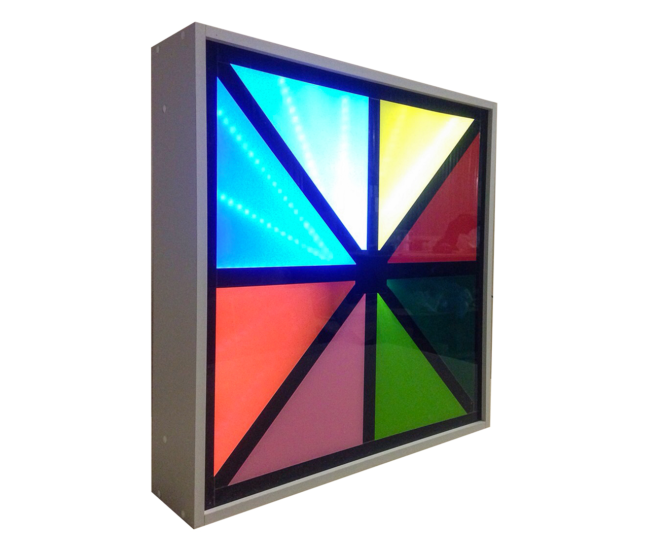 Размер 720х720х200мм. В зависимости от громкости звука разноцветное колесо начинает крутиться быстрее. Материалы: ЛДСП, акрил.