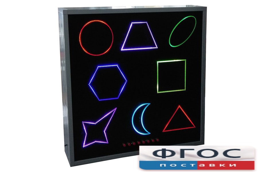 Настенная интерактивная сенсорная панель. Восемь светящихся фигур: окружность, треугольник, квадрат, звезда «Антарес», полумесяц, шестиугольник, эллипс, трапеция. Все фигуры включаются и выключаются независимо кнопками.