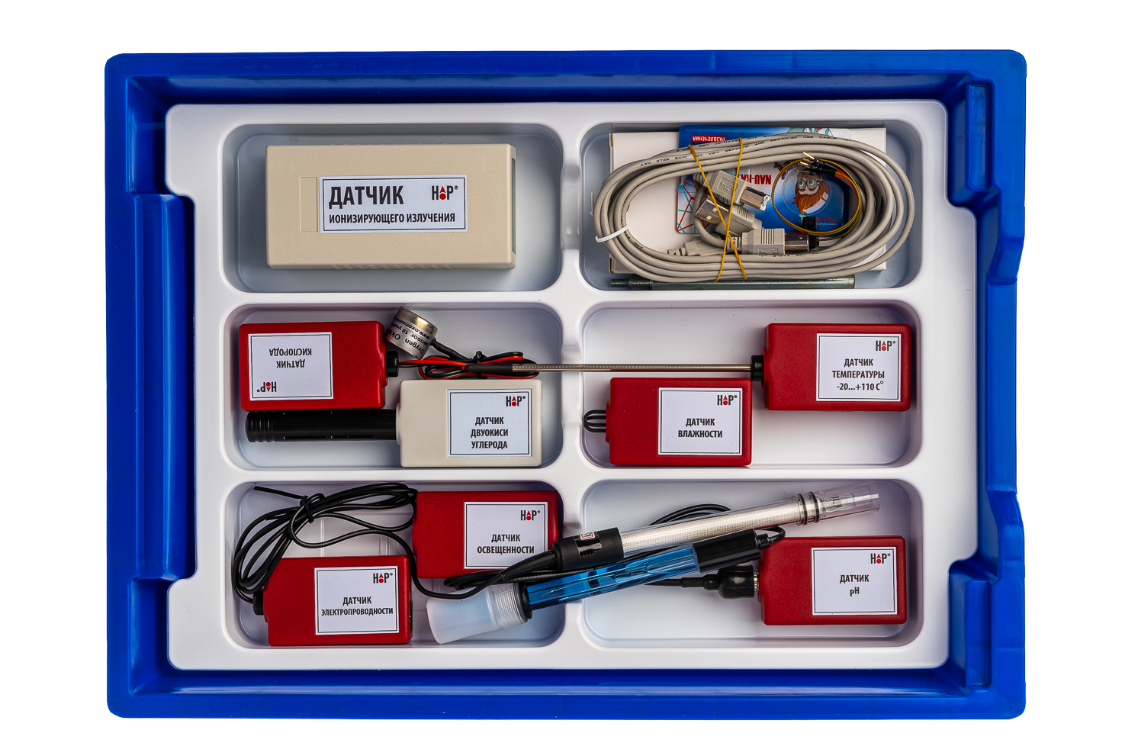 Комплект лаборатории позволяет проводить эксперименты инструментальными методами, с использованием цифровых датчиков и дополнительной оснастки.