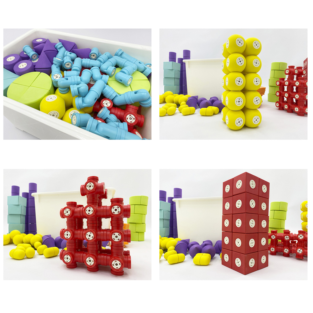 Детали конструктора окрашены в приятные однотонные цвета, со звуковым эффектом погремушки. Каждая из деталей имеет от 1 до 9 вариантов магнитной стыковки, что практически не ограничивает ребенка в конструировании. Простые детали отлично подходят для детей младшей группы ДОУ, детей с ОВЗ и РАС. Более сложные по форме и креплениям детали предназначены для детей средней и старшей группы.