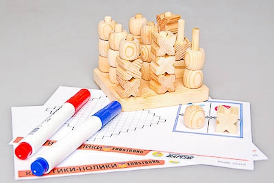 Набор крестиков-ноликов представляет собой деревянную основу с выступающими колышками, на которые нанизаны объемные деревянные фигуры крестиков и ноликов (всего 27 фигур). Игровые поля формата А5 изготовлены из картона, ламинированы пленкой, что позволяет писать на них маркером для белых досок. Написанное легко стирается сухой тряпкой.
