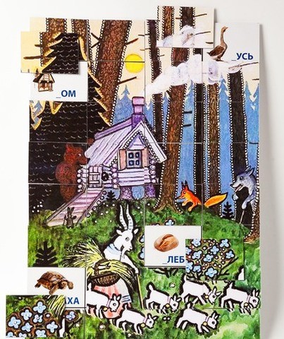 Найти правильные карточки нужно для всех изображений, нарисованных на игровом поле. Если все буквы будут найдены и положены правильно, то обратная сторона карточек сложится в иллюстрацию к русской народной сказке «Волк и семеро козлят», которую создал прекрасный художник Юрий Васнецов.