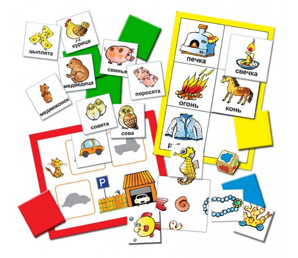 Первые игры, в которые мы предлагаем сыграть - это игра с кубиком и разноцветными карточками, варианты заданий "найди маму" и "прятки". Не забывайте, пожалуйста, что малышам легче решать поставленные перед ними задачи, если картинки наши "оживут": машинки ищут стоянки рядом с гаражами, слова на желтых - "сочиняют" песенки,  обитатели синих - "находят" свои хвостики...