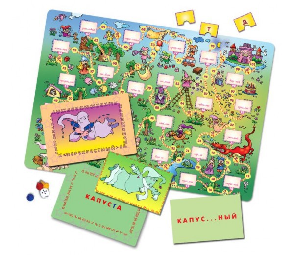 Скорость перемещения спешащих в Школу игроков "ходилки" зависит не столько от точек на кубике, сколько от грамотности "ходоков". На их пути то и дело встречаются окошки с трудными словами! При правильном выборе буквы можно двигаться дальше, а вот любые неверные решения оставляют игроков на месте: подумать и не ошибиться в следующий раз.
