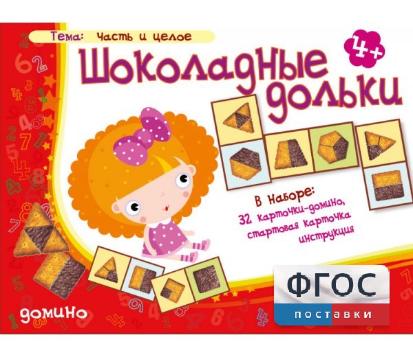 В игре - 32 маленьких карточки с поделенным на равные части печеньем. Печенье разной формы: квадратное, круглое, треугольное… Одни целиком шоколадные, а другие - разделены на разное количество частей. Считаем: первая часть, вторая часть… А третья, посмотрите, шоколадная. Самая заметная.