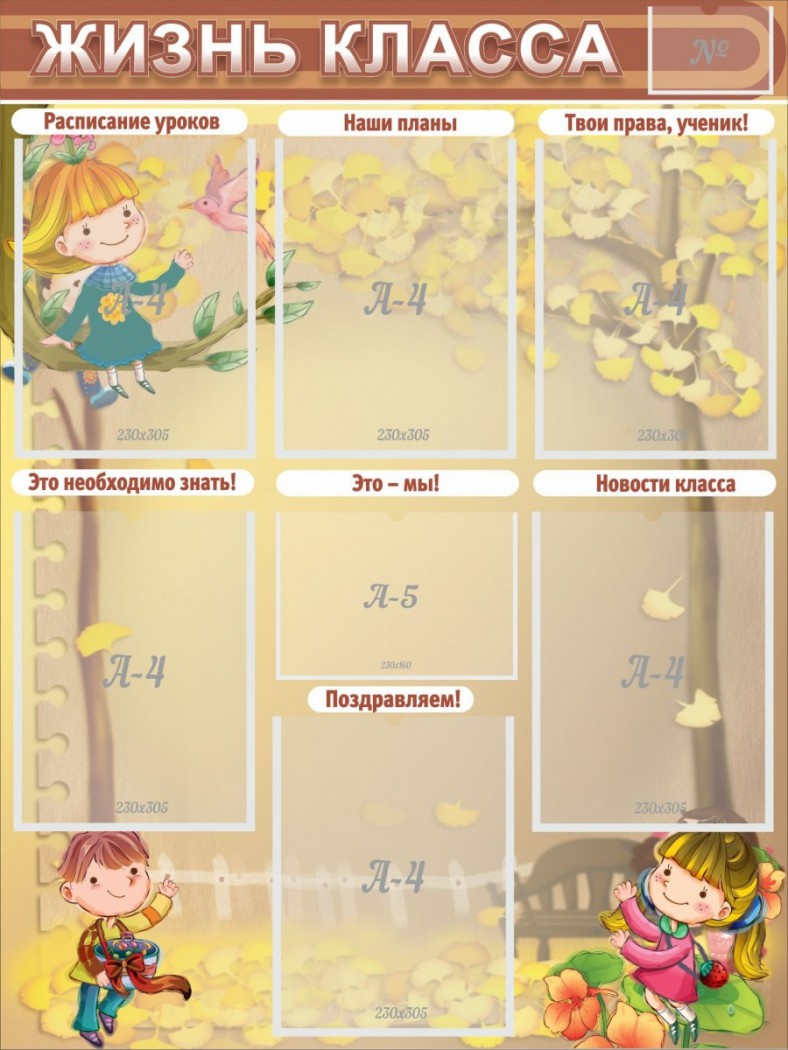 В любой школе нет ни одного класса, который был бы похож на другие. Этот стенд скорее подойдет для младших классов, так как на нем изображены сказочные и волшебные герои. Маленькие дети обычно с удовольствием рассматривают такие красочные яркие рисунки. Информационный стенд выполнен в стиле страницы домашнего фотоальбома. В центре предусмотрено место для фотографии всего класса. Это развивает командный дух у детей. Остальные карманчики должны быть заполнены стандартной информацией (расписание уроков, планы класса, права учеников, обязанности учеников, новости класса и поздравления именинникам месяца).