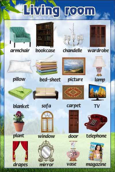 Яркий наглядный плакат "ГОСТИНАЯ" поможет Вашему классу легко выучить названия основных элементов общей комнаты, повторить названия мебели, украшений и аксессуаров.