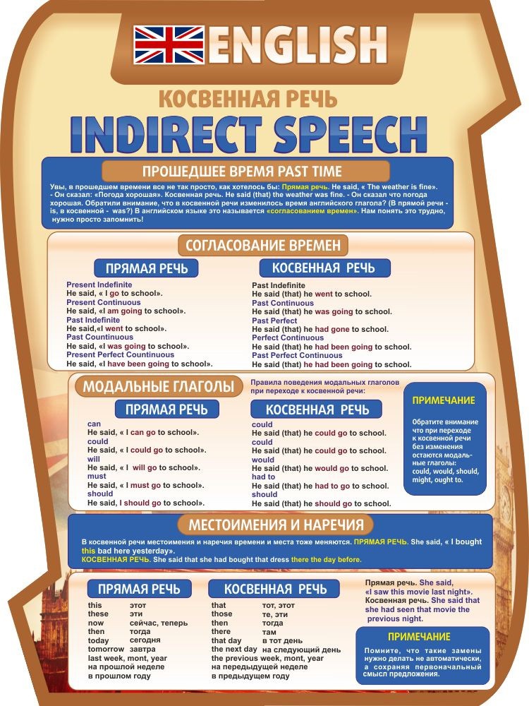 Употребление косвенной речи, согласование времен и модальные глаголы, такие сложные местоимения и наречия, нужные примечания – всё это в максимально удобной форме расположено на резном стенде.