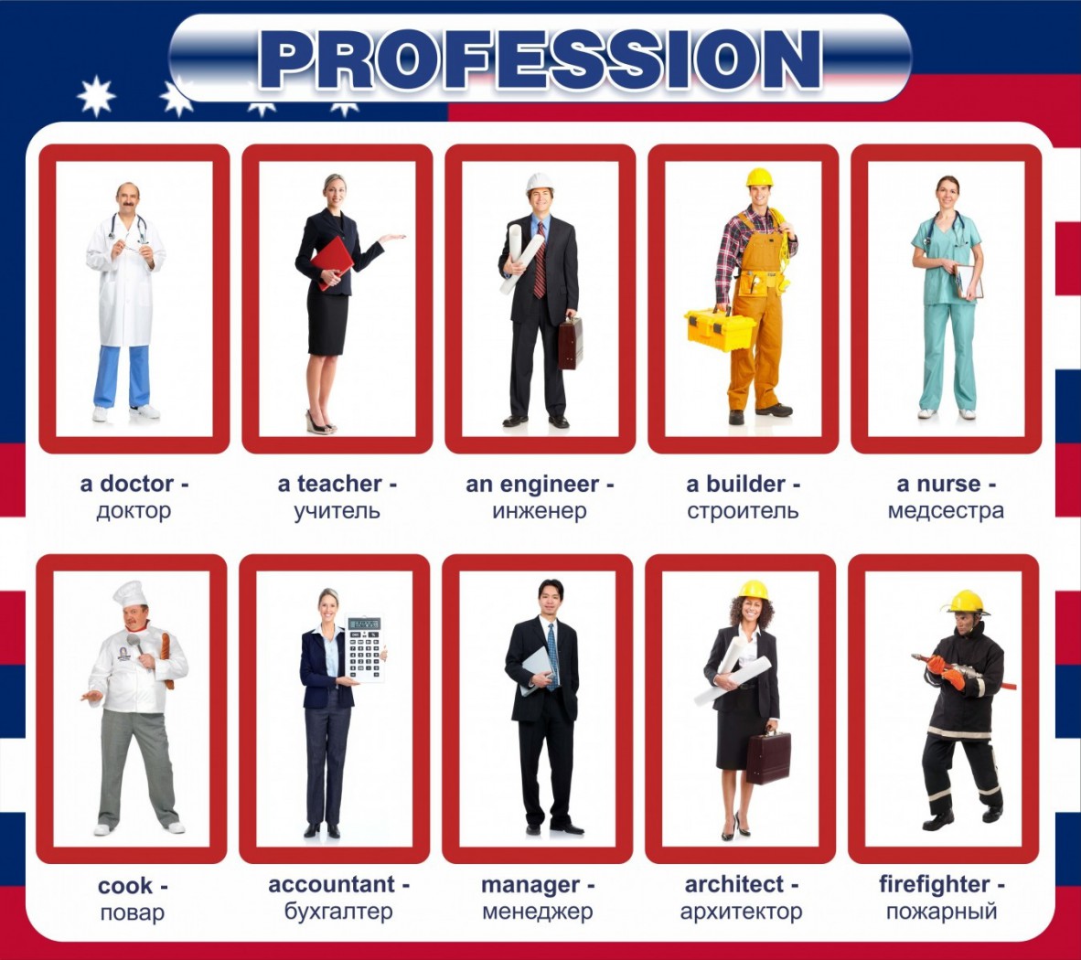 На красивом фоне флага США размещены десять, наиболее популярных профессий: доктор, учитель, инженер, строитель, медсестра, повар, бухгалтер, менеджер, архитектор и пожарный. Помимо красивых картинок на нем присутствуют подписи профессий с переводом, что поможет ученикам запомнить профессии быстро и надолго. Яркая надпись "PROFESSION" обратит на себя внимание учеников. Дизайн стенда подобран таким образом, что стенд впишется в интерьер любого класса и станет его частью. Качество порадует учителей. Такому стенду не будет страшно от количества лет. Он долгое время провисит на стене в отличном первоначальном состоянии.