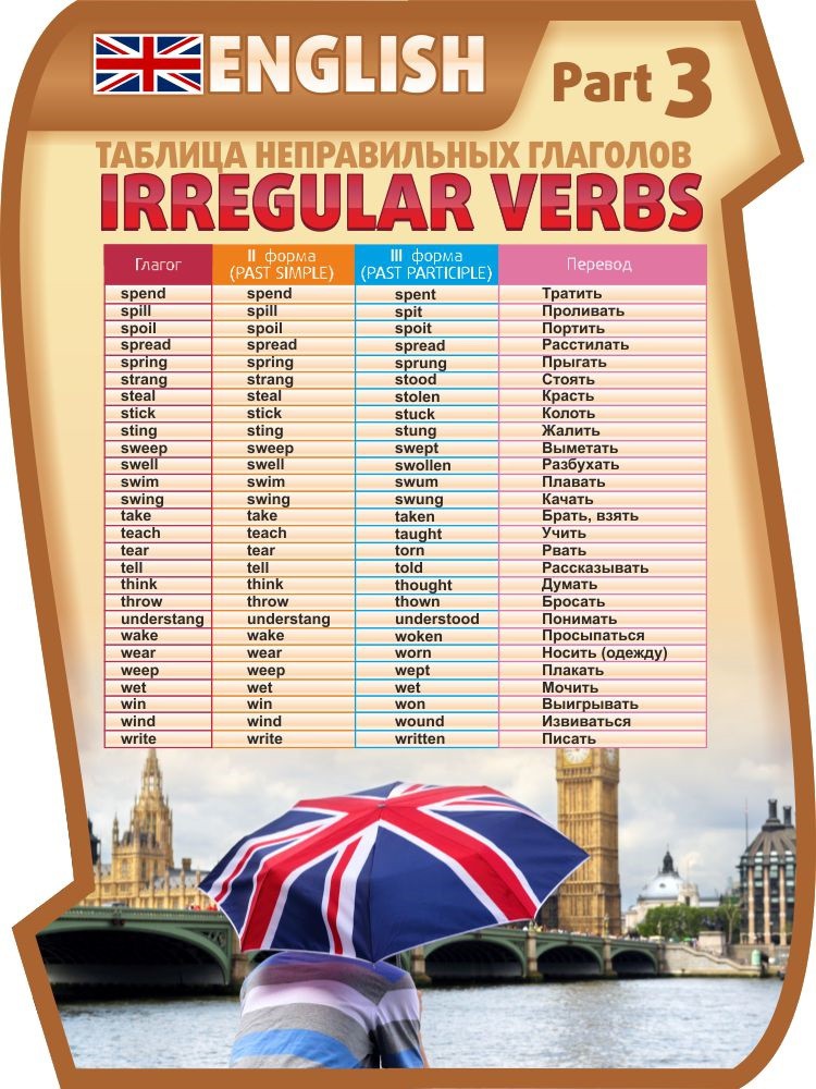 "ТАБЛИЦА НЕПРАВИЛЬНЫХ ГЛАГОЛОВ, ЧАСТЬ 3" подскажет Вашим ученикам нормы употребления глаголов в стандартной форме и, конечно, во временах Past Simple и Past Participle.