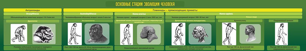 Настенный широкоформатный стенд, длиною в 2 метра, для школ и лицеев "ЭВОЛЮЦИЯ ЧЕЛОВЕКА" расскажет Вашим ученикам об основных стадиях эволюционных процессов. Шесть ключевых этапов, начиная от обезьяноподобных,  австралопитеков, древних прямоходящих и людей и человека разумного, заканчивая современным человеком.  Простая наглядная схема для качественного обучения.