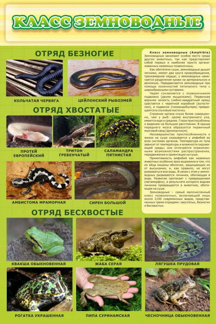 Яркий стенд с натуральными фотографиями земноводных: змей, саламандр, тритонов, квакш, жаб и лягушек станет отличным способом оформления кабинета биологии и, одновременно, полезным наглядным пособием для Ваших детей. Понятное описание, отчётливый шрифт, яркие природные фото, качественная основа - разве может наглядное пособие быть лучше?