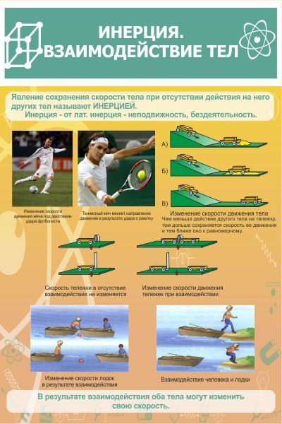 Физика — это современная наука, которая изучается в каждом образовательном учреждении. Стенд «Инерция. Взаимодействие тел» должен находиться в каждом кабинете физики для того, чтобы ученики могли использовать его как наглядное пособие и знали определение инерции и то, как происходит взаимодействие тел. Дизайн стенда разработан специально для учащихся так, чтобы информация, находящаяся на нем, был им понятна, а красочные иллюстрации исключают любое недопонимание темы. Пластик, из которого изготовлен стенд, качественный и достаточно легкий, благодаря чему можно легко перевозить и монтировать стенд.