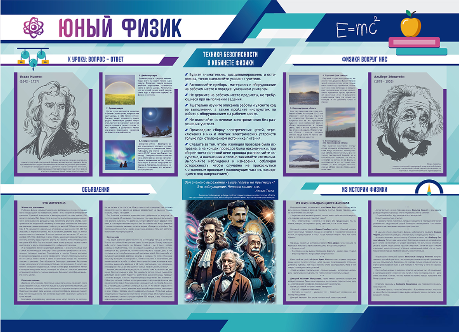 Стенд-уголок предназначен для наглядного отображения информации в области физики, а также для привлечения внимания учащихся к данному предмету.